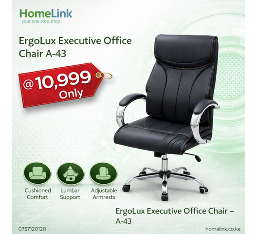 The ErgoLux Executive Office Chair A-43 is designed for professionals who value comfort, durability, and a refined executive look. With its cushioned high-back design and ergonomic support, this chair delivers all-day seating comfort while enhancing the appearance of any office space.